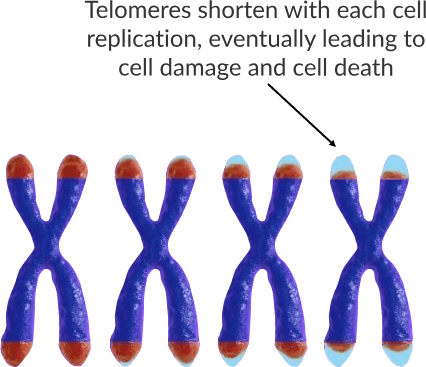 Every time a cell replicates, the telomeres (strands of DNA) at the ends of our chromosomes get shorter